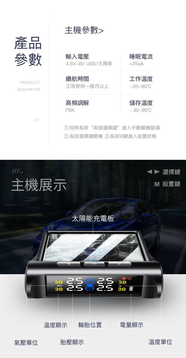 半小時前【官方站】太陽能無線胎壓監測器 輪胎盡在掌控!【太陽能 胎壓監測器】漏氣警報,胎壓警報,胎溫警報【太陽能電光板】無需佈線,可任意擺放!適用於所有輪胎,安裝超簡單,一看就會! - 【太陽能 胎壓監測器】